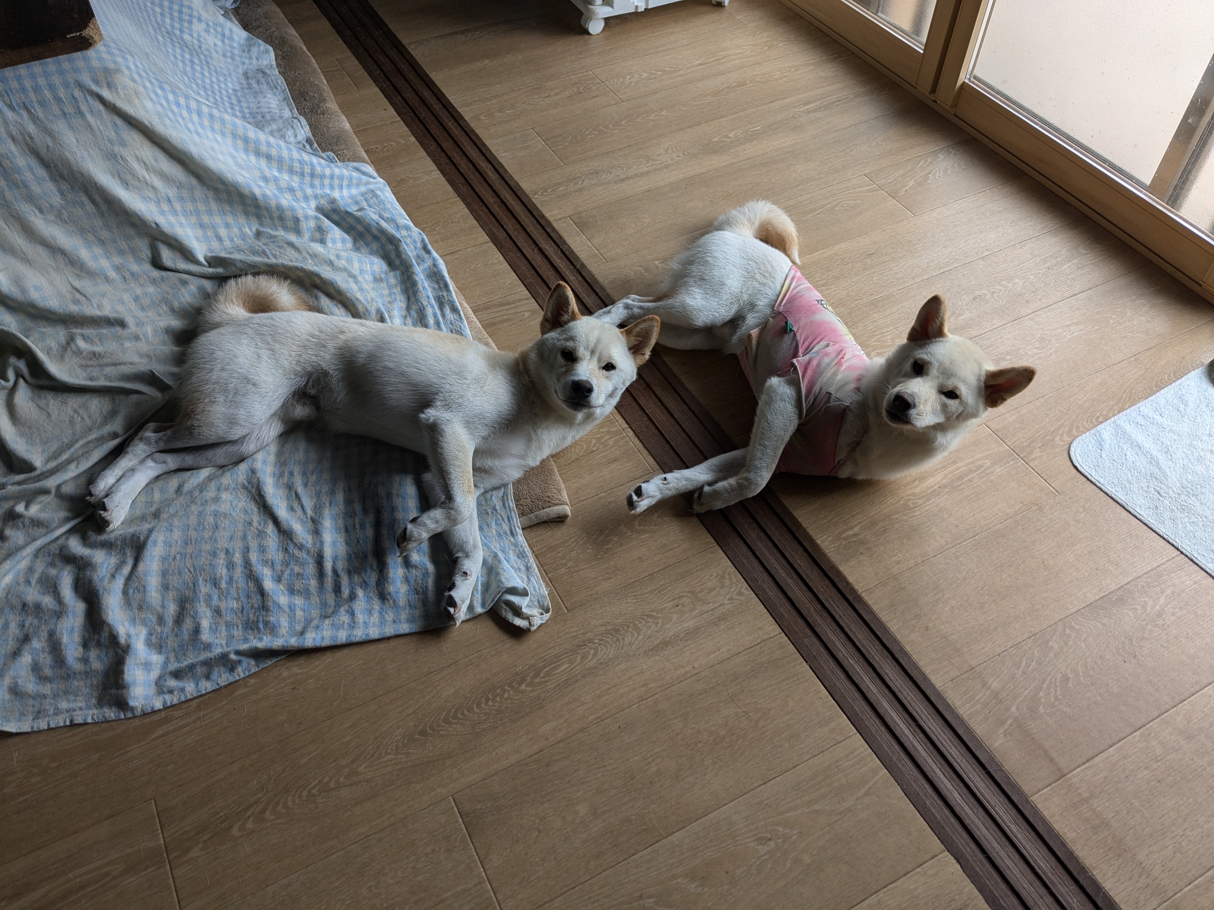 外で元気に走り回った後は、クーラーの一番効いてるところで列になって眠ります。