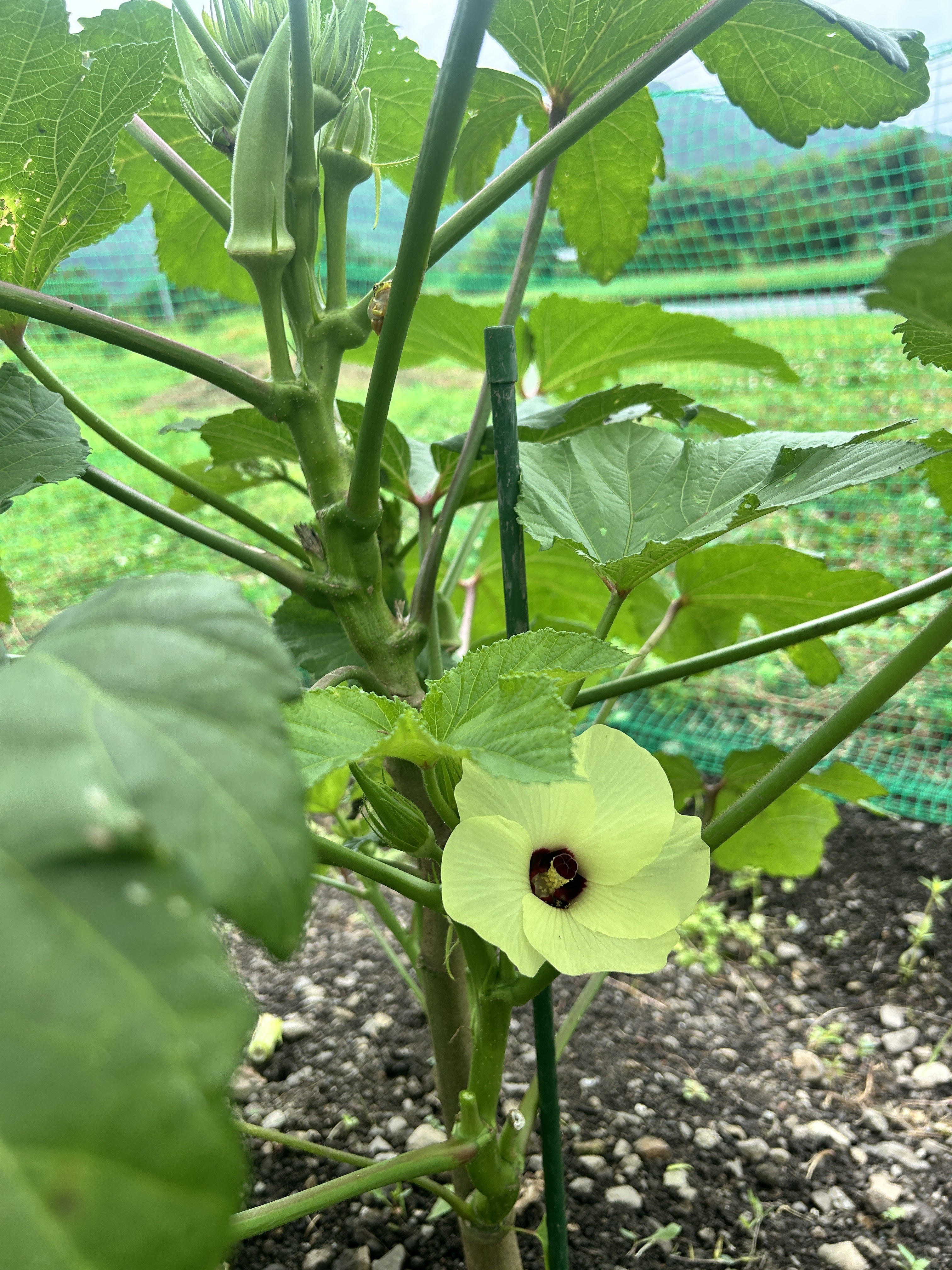 オクラの花に蛙さん